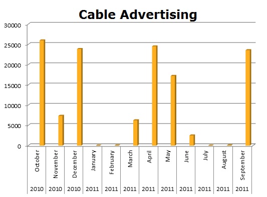 On Local Cable, the TJX Companies ran 131,361 spots in the last 12 months. The biggest month was October 2010 with 25,994 ads. Between the three media, TJX runs the most on Cable at 46.9%.
