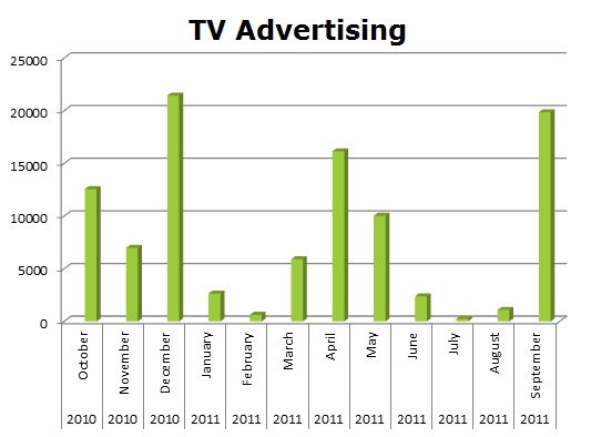 On TV, TJX Companies ran 99,920 spots in the last 12 months with hot months of last December with 21,449 and this September (2011) with 19,867 spots.
