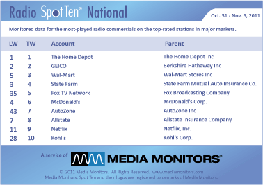 THE HOME DEPOT remains in the #1 slot with 50,941 radio spots in the country last week. Coming in #2 was GEICO with 37,083 commercials, while WAL-MART continues to grow from #5 to #3 with 36,841 spots. STATE FARM drops to #4 with 33,460 spots and soaring from #35 to #5 was FOX TV NETWORK with 28,952 ads.