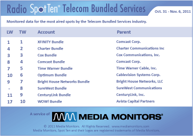 The war in telecommunications today is how companies bundle TV, telephone and Internet services. In this category last week XFINITY BUNDLE, Comcast’s offering, was #1 running 3,386 spots nationwide. CHARTER BUNDLE was #2 with 2,994 commercials, while the COX BUNDLE stayed at #3 airing 2,051 announcements. COMCAST BUNDLE (same company) was #4 with 2,033 ads, while TIME WARNER BUNDLE landed in #5 with 824 spots. OPTIMUM BUNDLE (Cablevision) was in at #6 running 469 spots and BRIGHT HOUSE NETWORKS BUNDLE hit #7 with 395 commercials. SUREWEST BUNDLE was #8 with 383 spots, while CENTUR LINK BUNDLE held #9 airing 293 spots. In at #10 was WOW! BUNDLE with 172 spots.