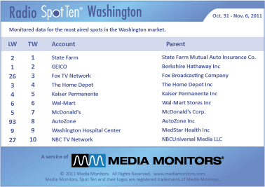 In our Nation’s Capital last week, the #1 radio spot was STATE FARM running 880 units. GEICO was #2 airing 829 announcements, while FOX TV NETWORK leaped into #3 with 759 spots. THE HOME DEPOT was #4 with 754 spots and KAISER PERMANENTE was #5 with 660 spots. WAL-MART was steady at #6 running 608 commercials, while MCDONALD’S was #7 with 584 spots. AUTOZONE zoomed from #93 to #8 with 412 spots and WASHINGTON HOSPITAL CENTER was #9 with 384 spots. NBC TV NETWORK was #10 with 352 spots