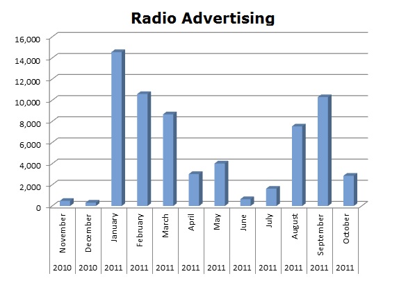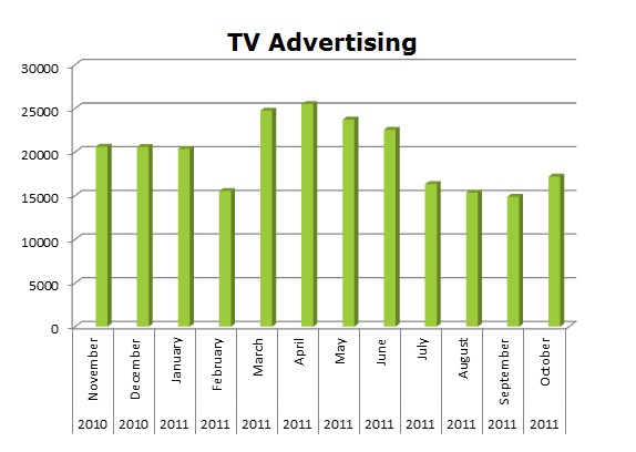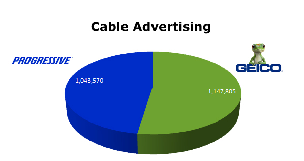 On TV, they both ran fewer spots than the other media. Progressive ran 412,936 spots against GEICO’s 379,554 spots. GEICO’s biggest month was this last November 2011 with 39,138 spots to Progressive’s March when they cleared 67,574 spots.