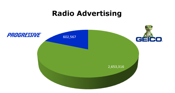 Radio, GEICO clobbers Progressive. GEICO ran 2,653,316 spots, while Progressive ran 602,567 spots in the last 12 months. GEICO’s biggest month was January with 301,232 spots and Progressive ran hottest in March with 67,574 ads.