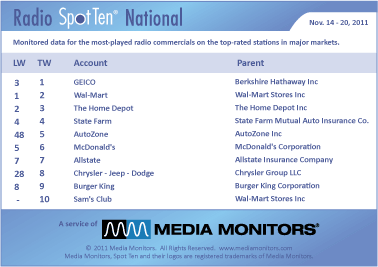 In Cleveland, Ohio the #1 radio advertiser was BILL DORATY KIA with 828 spots. CHRYSLER JEEP DODGE was #2 airing 623 spots, while GIANT EAGLE bagged #3 running 595 commercials. KIA OF BEDFORD drove from #14 to #4 with 547 spots and ACE CASH EXPRESS was #5 with 490 spots. THE HOME DEPOT landed in #6 with 414 spots, while FOX TV was #7 running 413 spots. WAL-MART dropped from #3 to #8 with 387 spots and GEICO was #9 with 385 spots. Coming in #10 was MCDONALD’S with 365 spots.