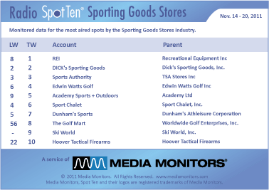 In the Sporting Goods category, the #1 radio advertiser was REI with 6,545 spots nationwide. DICK’S SPORTING GOODS held on to #2 with 697 ads, while the SPORTS AUTHORITY stayed at #3 with 500 spots. EDWIN WATTS GOLF swung into #4 with 380 ads and ACADEMY SPORTS + OUTDOORS graduated from #9 to #5 running 288 commercials. SPORTS CHALET scored #6 airing 282 announcements, while DUNHAM’S SPORT landed in #7 with 253 ads. THE GOLF MART soared from #56 up to #8 last week with 243 spots and SKI WORLD came in #9 with their 217 spots. HOOVER TACTICAL FIREARMS shot up from #22 to #10 with 191 spots.