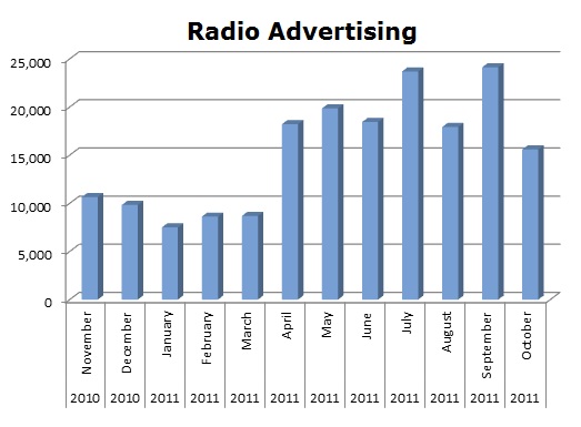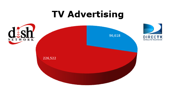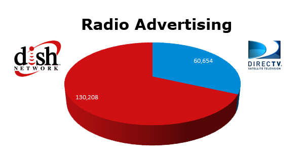 On Radio, the DISH Network ran 130,208 spots in the last 12 months, while DIRECTV cleared 60,654 spots. DIRECTV ran the most in November 2010 with 9,955 spots and the DISH Network ran the most in the same month last year with 17,727 spots.