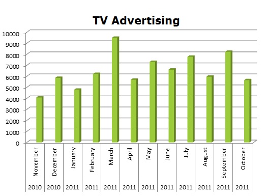 On TV, they ran 77,643 ads in the last 12 months with their biggest month being March 2011 when they ran 9,496 ads.