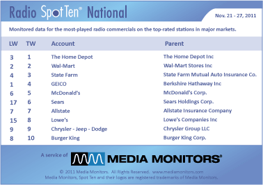 THE HOME DEPOT took back #1, up from #3, with 50,924 spots. WAL-MART was #2 clearing 35,552 ads, while STATE FARM was #3 with 31,577 commercials. GEICO was #4 with 31,380 spots. MCDONALD’S ran 27,733 spots and landed in #5.