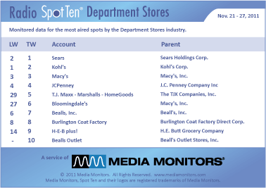 SEARS was the #1 advertiser in this category with 20,932 spots. KOHL’S took #2 with 19,159 spots, while MACY’S was steady at #3 airing 10,156 ads. JCPENNEY stayed at #4 with 9,521 spots and T.J.MAXX – MARSHALLS – HOMEGOODS leaped from #29 to #5 with 3,809 commercials. BLOOMINGDALE’S zoomed from #29 to #5 with 1,373 spots and BEALLS, INC was #7 with 995 spots. BURLINGTON COAT FACTORY was a solid #8 running 880 spots, while H-E-B PLUS! came from #14 to #9 with 829 spots. BEALLS OUTLET was #10 with 428 spots.