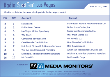 STATE FARM was the #1 advertiser in Las Vegas last week with 915 spots. DOLLAR LOAN CENTER was #2 running 881 ads, while LAS VEGAS MOTOR SPEEDWAY was #3 airing 797 commercials. WAL-MART landed at #4 with 737 spots and CENTENNIAL TOYOTA SCION took #5 706 spots. ONE NEVADA CREDIT UNION was #6 with 693 ads, while US DEPARTMENT OF HEALTH & HUMAN SERVICES hit #7 airing 650 spots and YES! AIR CONDITIONING & PLUMBING landed at #8 with 612 spots. MICHAEL E. MINDEN DIAMOND JEWELERS sparkled at #9 with 567 spots and MCDONALD’S jumped from #26 to #10 with 553 spots.