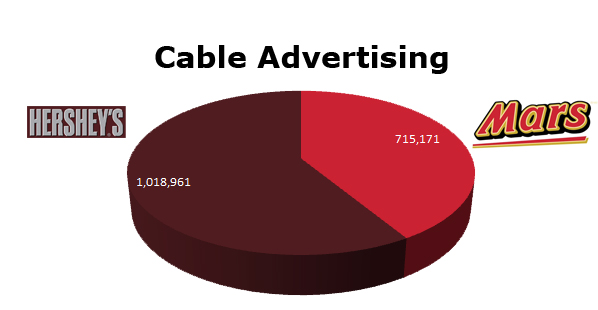 On Cable, Mars aired 70.19% as many spots as Hershey’s in the last 12 months. Mars ran 715,171 spots against Hershey’s 1,018,961 commercials. Hershey’s biggest month on Local Cable was last month with 113,168 spots. That’s a lot of kisses. Mars ran hottest last March with 68,331 spots.