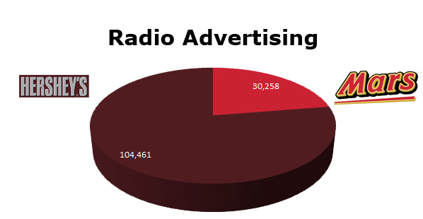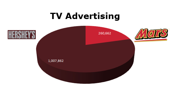 On TV, Mars aired 25.86% as many spots as Hershey’s. Hershey’s cleared 1,007,862 spots against Mars 260,662 spots. The biggest month for Hershey’s was last December with 112,888 ads, while Mars ran the most in August with 32,899 spots.