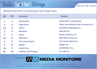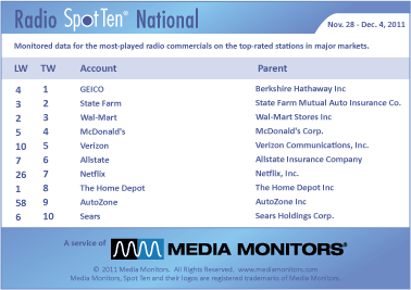 GEICO and the gecko are back on top at #1 with 42,268 commercials on radio. STATE FARM moved from #3 to #2 with 35,205 ads, while WAL-MART held #3 with 31,546 spots. MCDONALD’S was #4 with 26,304 spots and VERIZON reenters the top five with 25,534 spots. (Of note: THE HOME DEPOT dropped from #1 to #8 with 19,052 spots).