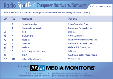 The #1 radio advertiser in this category was CYBERDEFENDER with their 2,955 spots. Coming in #2 last week was BARRACUDA NETWORKS with 2,362 ads, while DELL ranked #3 with 938 spots. GOTOMYPC linked into #4 with 894 spots and NUANCE was #5 with 848 commercials. CUDATEL (part of Barracuda Networks) was #6 with 554 ads, while WEBROOT was #7 running 292 spots. AOL COMPUTER CHECKUP landed at #8 with 232 spots and ASUS held steady at #9 airing 191 announcements. INTERNETSAFETY.COM was #10 with 169 spots.