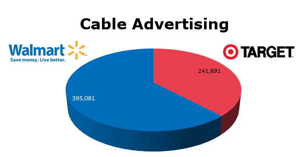 On Local Cable Target ran 241,891 spots in the last 12 months against Wal-Mart’s 395,081 ads. Target ran 61.23% as many spots as Wal-Mart. Targets biggest month on Cable was last December with 39,550 spots, while Wal-Mart ran hottest last month, November 2011, with 114,233 spots.