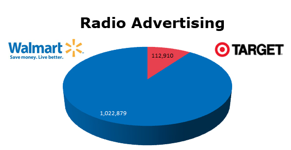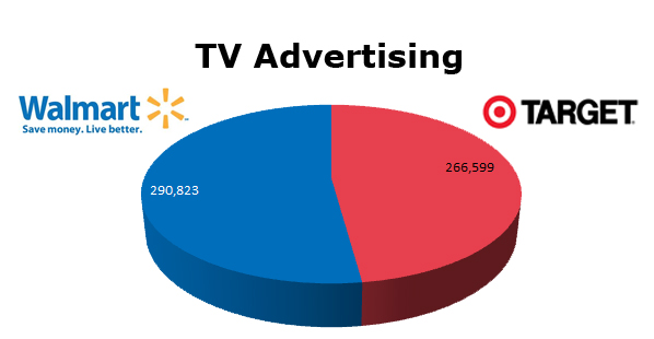 On TV, Wal-Mart ran 290,823 spots against Target’s 266,599 in the last 12 months. Target’s biggest month was last December with 51,914 spots, while Wal-Mart ran hottest last month with 57,250 spots.