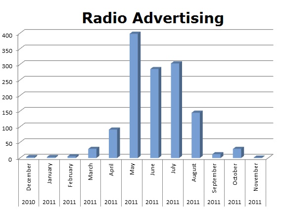 Radio is not an important media for them with only 1,304 spots in the last 12 months. Once again, May was their biggest month with only 398 spots nationally.