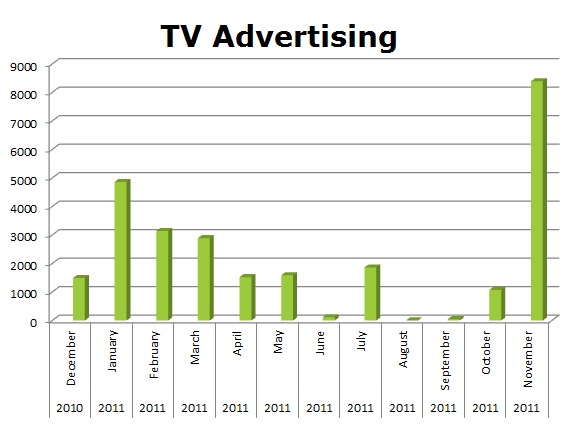 They seem to be using a bit of a different strategy with TV, running the most spots last month with 8,392 ads. They totaled 26,999 spots in the last 12 months on TV.