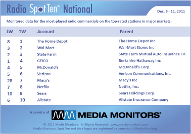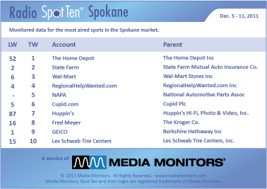 Last week in Spokane the #1 radio advertiser was THE HOME DEPOT with 717 spots. STATE FARM was #2 airing 510 announcements, while WAL-MART landed in #3 running 469 commercials. REGIONALHELPWANTED.COM was steady at #4 with 415 spots and NAPA drove into #5 with 390 ads. CUPID.COM loved #6 with 388 spots, while HUPPIN’S rose from #87 to #7 with 279 spots. FRED MEYER bagged #8 with 278 spots and GEICO slipped from #1 to #9 with 276 spots. And in at #10 was LES SCHWAB TIRE CENTERS with 274 spots.