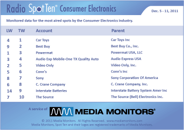 In this category, CAR TOYS tops the list with 2,244 spots. BEST BUY was #2 airing 1,980 ads, while POWERMAT took #3 with 1,977 spots. AUDIO EXP MOBILE-ONE TX QUALITY AUTO was #4 with 1,457 spots and VIDEO ONLY was #5 running 1,309 commercials. CONN’S at #6 with 964 spots, while SONY secured #7 with 796 spots. C.CRANE COMPANY was #8 with 793 spots and INTERSTATE BATTERIES charged #9 running 759 spots. And coming in #10 was THE SOURCE (Bell Electronics) with 708 spots.