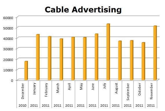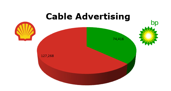 On Local Cable, Shell ran 127,268 spots in the last 12 months against BP’s 74,416 ads. Shell’s biggest month was April 2011 with 21,906 spots, while BP ran hottest last December 2010 with 16,160 spots.