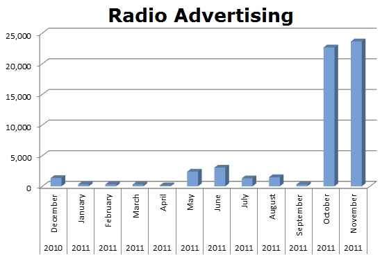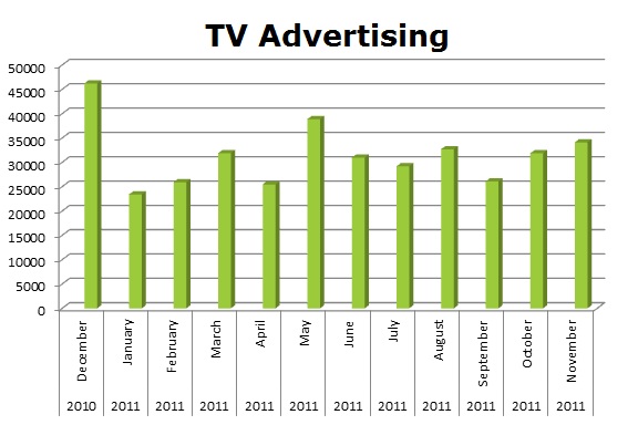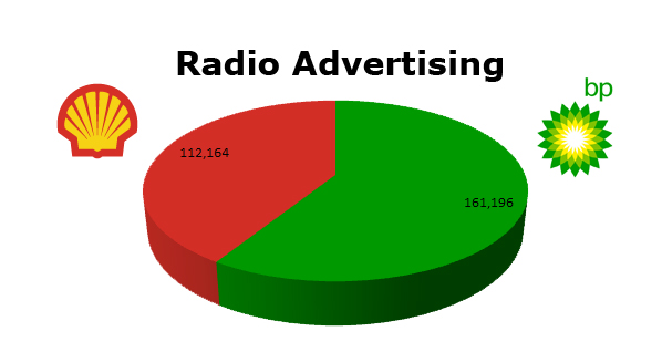 On Radio, Shell ran slightly behind BP. Shell ran 112,164 spots, while BP ran 161,196 spots in the last 12 months. BP ran 22,966 spots last December and then hit 21,183 this October. Shell’s biggest month on radio was May 2011 when they ran 20,458 spots.