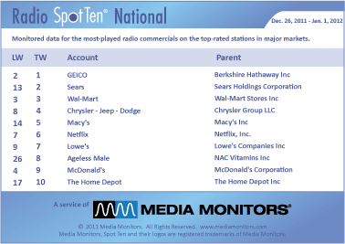 Back on top was GEICO to end the year on a positive note running 60,644 spots. Coming in #2 was SEARS, up from #13 airing 36,673 – the same week they announced they would be closing some stores. WAL-MART held solid at #3 clearing 30,028 spots, while CHRYSLER JEEP DODGE came from #8 to #4 with 26,197 spots. MACY’S moved from #14 to #5 with 25,810 spots.