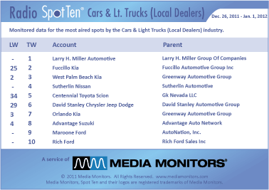 And the numbers on specific dealers last week in all the markets looks good as well. LARRY H MILLER AUTOMOTIVE with dealers in UTAH and ARIZONA was #1 in LOCAL DEALER category with 1,694 spots. Upstate New York’s FUCCILLO KIA was #2 in the nation with 1,526 spots, which as they say, IS HUGE! WEST PALM BEACH KIA captured #3 with 1,277 ads, while in the SOUTHEAST SUTHERIN NISSAN secured #4 with 1,163 spots. CENTENNIAL TOYOTA SCION soared in LAS VEGAS from #34 to #5 with 1,149 spots and DAVID STANLEY CHRYSLER JEEP DODGE in OKLAHOMA was okay at #6 with 1,076 spots. ORLANDO KIA landed at #7 running 1,013 spots, while ADVANTAGE SUZUKI in the NEW YORK area cemented #8 with 955 ads. MIAMI’S MAROONE FORD reached #9 with 938 spots and in ALBUQUERQUE, RICH FORD came in #10 airing 931 commercials.