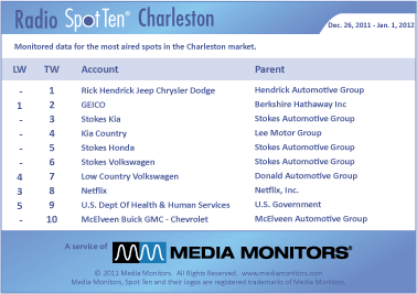 In Charleston, SC last week, you will notice lots of cars dealers and the name STOKES. The #1 radio advertiser was RICK HENDRICK JEEP CHRYSLER DODGE with 879 spots. Coming in #2 was GEICO airing 686 announcements, while STOKES KIA landed in #3 with 605 spots. KIA COUNTRY took #4 running 519 spots and STOKES HONDA held #5 with 517 ads. STOKES VOLKSWAGEN controls #6 with 513 spots, while LOW COUNTRY VOLKSWAGEN dropped from #4 to #7 with 433 spots. NETFLIX clicked into #8 with 386 spots and the US DEPARTMENT OF HEALTH & HUMAN RESOURCES was #9 with 370 spots. In at #10 is MCELVEEN BUICK GMC – CHEVROLET with 361 spots.
