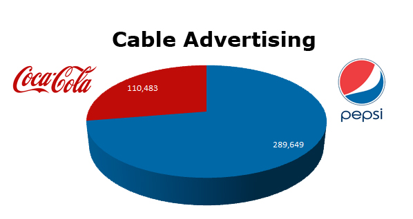 On Cable TV, Pepsi outshined Coca-Cola. Pepsi ran 289,649 spots in the last 12 months compared to Coca-Cola’s 110,483 ads. Coke’s biggest month on Cable was September 2011 with 14,950 spots, while Pepsi was hottest in July 2011 with 35,514 spots.