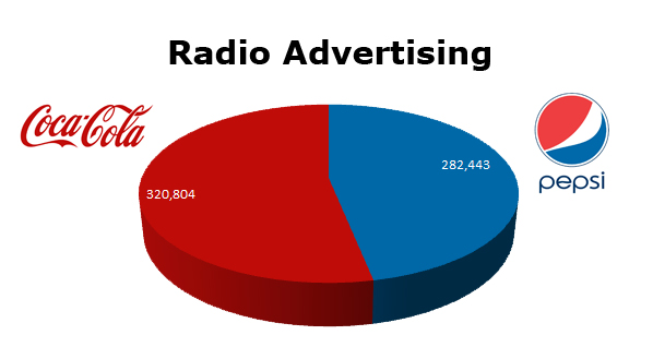 On the Radio, Coca-Cola edges out Pepsi. Coke ran 320,804 spots in the last 12 months against Pepsi’s 282,443 ads. Coke’s biggest month was last December with 68,655 spots, while Pepsi went all in with 50,387 spots in June 2011.