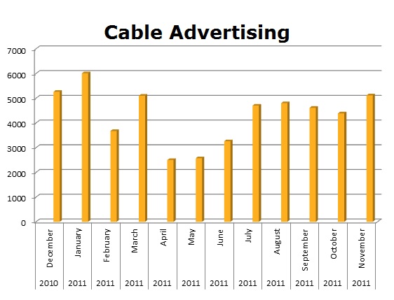 On Cable, RAC ran 51,960 spots in the last 12 months. The biggest Cable month was last January 2010 when they cleared 6,006 spots.