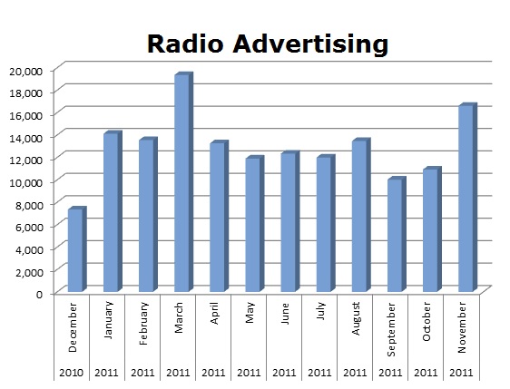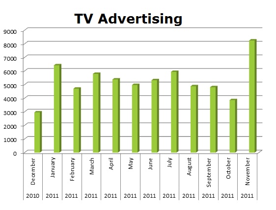 TV is an important part of the mix for RAC with 63,250 spots ran in the last 12 months. The biggest TV month was last month November 2011 with 8,243 spots.