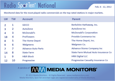 The king of radio advertising regains the throne as GEICO takes back #1 airing 44,793 spots last week. AUTOZONE moves from #3 to #2 with 27,694 spots and MCDONALD’S settles into #3 running 26,678 spots. PROFLOWERS soars from #18 to #4, just in time for Valentine’s Day, with 23,858 spots. THE HOME DEPOT moved from #8 to #5 with 23,728 spots.