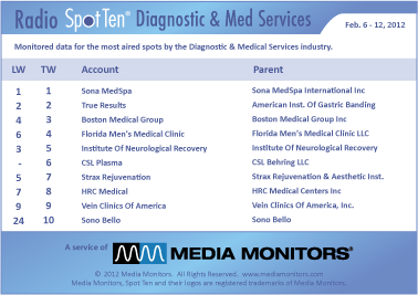 #1 in the medical diagnostic services category was SONA MEDSPA with 1,205 commercials. TRUE RESULTS was #2 with 644 spots, while BOSTON MEDICAL GROUP was #3 with 572 spots. #4 was FLORIDA MEN’S MEDICAL CLINIC with 440 spots and INSTITUTE OF NEUROLOGICAL RECOVERY was #5 with 424 ads. CSL PLASMA was #6 with 381 spots, while STRAX REJUVENATION hit #7 with 349 spots. HRC MEDICAL was #8 airing 338 announcements and VEIN CLINICS OF AMERICA was #9 with 287 spots. And coming in #10 was SONO BELLO with 231 spots.