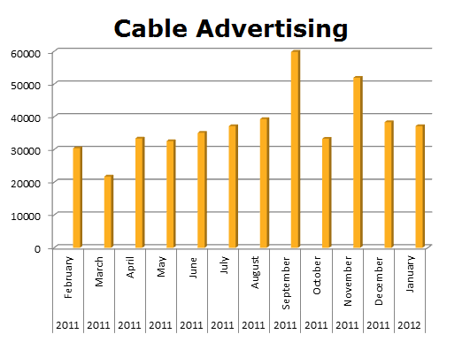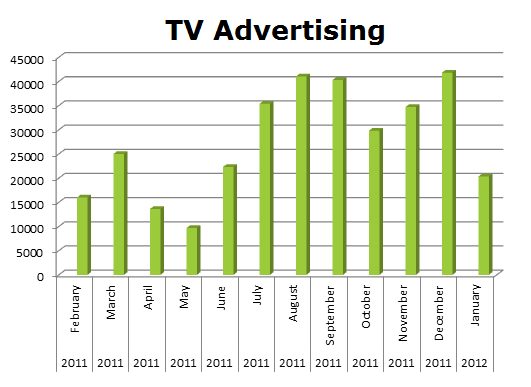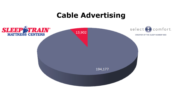On Local Cable, Select Comfort has clicked up the spots to 194,177 in the last 12 months against Sleep Train’s 13,902 ads. The biggest month for Select Comfort was last month, January 2012, with 32,873 spots, while the Sleep Train ran the most in January as well, with 1,893 ads.