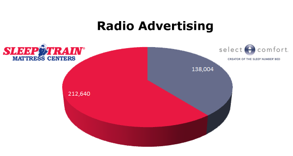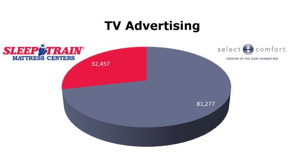 On TV, Select Comfort ran 81,277 spots in the last 12 months, while Sleep Train ran 32,457 spots. Select Comfort was hottest in January with 12,272 spots and Sleep Train also ran the most spots in January 2012 with 5,148 ads.