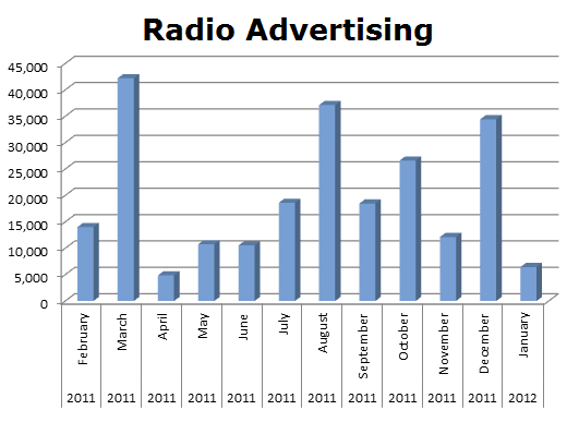 On the Radio, Nissan seems to have an up and down flight schedule through the year. March was the biggest month with 42,197 spots, then spiking up again in August with 37,121 and then running hot in December with 34,420 ads. The total radio ads in the last 12 months totaled 236,104 spots.