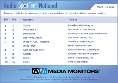 GEICO continues its streak at #1 with 44,069 spots last week. MCDONALD’S showing some power moves from #3 to #2 with 27,076 spots. STATE FARM climbs from #7 to #3 with 19,473 spots, while THE HOME DEPOT starts back up from #8 to #4 with 18,406 commercials. Coming in #5 O’REILLY-CSK-MURRAY’S with 18,381 spots. Of note: new to the top ten this week, WELLS FARGO with 18,273 spots at #6.