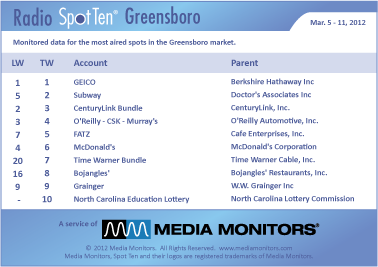 Last week in Greensboro the #1 radio advertiser was GEICO with 598 spots. SUBWAY was #2 running 403 commercials, while CENTURYLINK BUNDLE connected at #3 airing 332 announcements. O’REILLY-CSK-MURRAY’S managed at #4 with 307 spots and FATZ (Café) was #5 serving up 303 ads. MCDONALD’S hit #6 with 297 spots, while TIME WARNER BUNDLE bounced from #20 to #7 with 271 spots. BOJANGLES’ moved from #16 to #8 with 241 spots and GRAINGER was a solid #9 with their 240 commercials. NORTH CAROLINA EDUCATION LOTTERY was #10 with 239 spots.