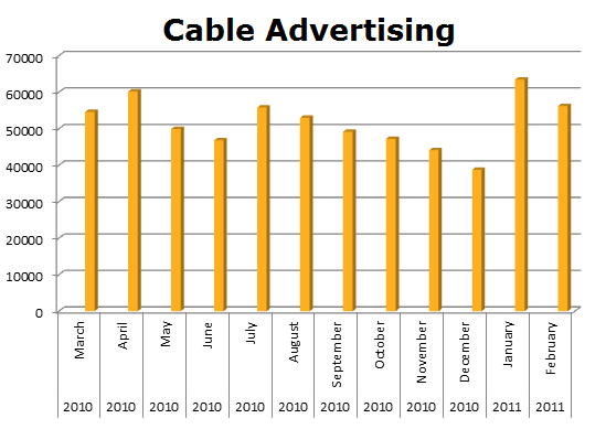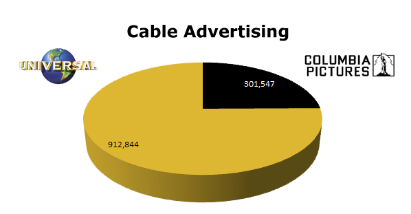 On Local Cable, Universal ran 912,844 spots in the last 12 months, while Columbia Pictures ran 301,547 ads. Universal’s biggest month was last March 2011 when they ran 119,922 ads and Columbia’s biggest month was last October with 53,503 spots.