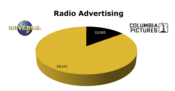 On Radio, Universal ran 58,341 spots in the last 12 months, while Columbia Pictures only ran 10,065 spots in the same period. Universal’s biggest month was November 2011 with 12,105 ads, while Columbia ran hottest in August with 6,587 spots.