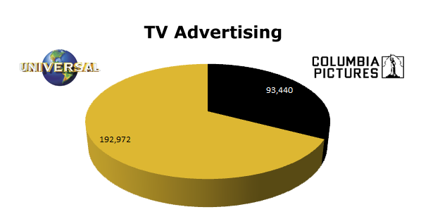 On TV, Universal cleared 192,972 ads in the last 12 months, while Columbia delivered 93,440 spots. Columbia ran the most last December with 16,102 ads against Universal’s biggest month being last March 2011 when they ran 28,797 ads.
