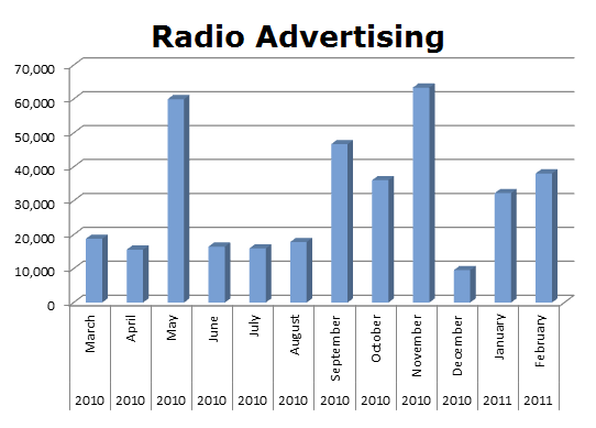 On Radio, Fox Entertainment ran 370,759 spots in the last 12 months with big months being May (59,975), September (46,696) and November being the biggest with 63,395 spots.
