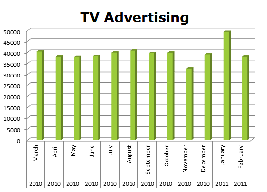 On TV, Fox ran 473,288 spots in the last 12 months with the high point coming in January with 49,381 spots.