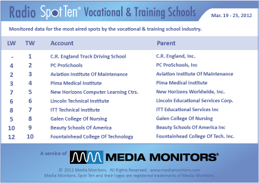 In the category of Vocational Training Schools, C.R. ENGLAND TRUCK DRIVING SCHOOL parks at #1 with 719 spots nationwide. PC PROSCHOOLS sets up at #2 with 528 ads, while AVIATION INSTITUTE OF MAINTENANCE lands at #3 airing 493 spots. PIMA MEDICAL INSTITUTE takes #4 with 466 commercials and NEW HORIZONS COMPUTER LEARNING CENTERS connect at #5 with 437 spots. LINCOLN TECHNICAL INSTITUTE was solid at #6 with 384 ads, while ITT TECHNICAL INSTITUTE was #7 running 341 commercials. GALEN COLLEGE OF NURSING was #8 with 309 spots and BEAUTY SCHOOLS OF AMERICA was #9 with 308 ads. FOUNTAINHEAD COLLEGE OF TECHNOLOGY took #10 with their 267 spots.