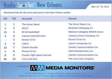 The #1 radio advertiser in New Orleans last week was THE HOME DEPOT with 472 spots. Coming in #2 was GEICO with 433 commercials, while NCAA BASKETBALL leaps from #15 to #3 with 314 ads. CAESARS ENTERTAINMENT stays steady at #4 and rolled 307 spots and ROOMS TO GO moved into #5 running with 299 spots. LOWE’S was #6 with 293 spots, while CHARTER BUNDLE (Cable, Phone, Internet) was #7 airing 279 announcements. DISNEY ON ICE skated into #8 with 263 spots and CHARTER HIGH SPEED INTERNET logged in at #9 with 244 spots Soaring from #90 to #10 was COCA-COLA ZERO 238 spots.