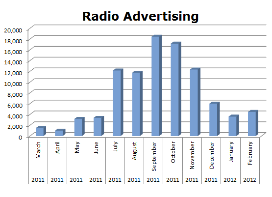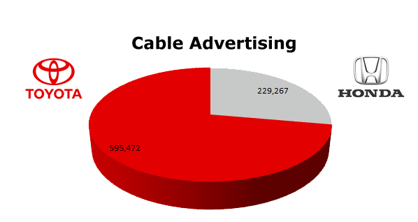 On Radio, Toyota ran 527,714 spots against Honda’s 243,894 spots in the last 12 months. Toyota’s hottest month was January 2012 with 63,239 spots, while Honda’s biggest month was last March 2011 with 51,655 spots.