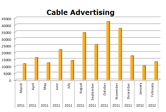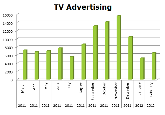 On Broadcast TV, Toyota leads again with 690,564 spots in the last 12 months, while Honda ran 484,923 spots. Toyota’s biggest month was December 2011 with 76,740 spots and Honda ran hottest last month January 2012 with 58,214 spots.