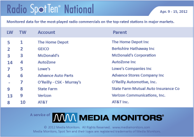 Last weeks' national spot radio map has THE HOME DEPOT with 59,170 spots. GEICO stays steady at #2 with 40,566 spots, while MCDONALD’S holds at #3 with 27,567 spots. AUTOZONE came in at #4 with 21,422 spots and LOWE'S drops lands #5 with 18,669 spots.